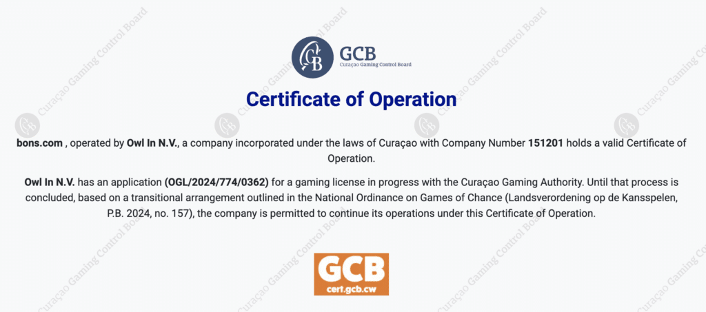 ボンズカジノはオランダ領キュラソー政府発行のカジノライセンスを取得している合法のオンラインカジノです。