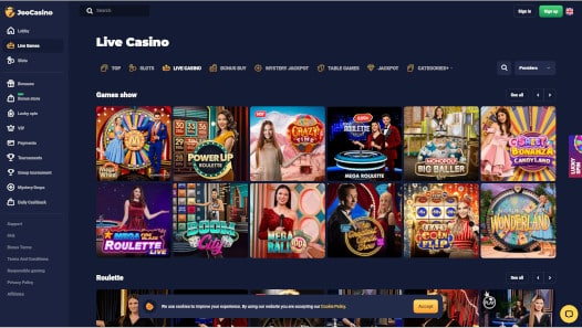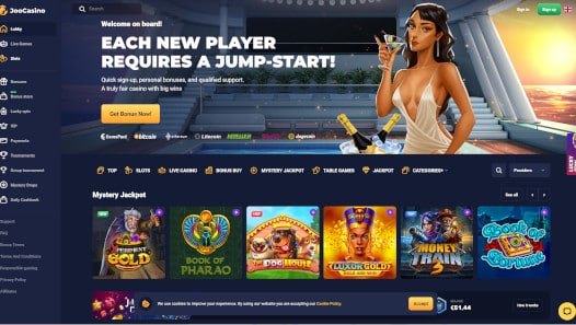 ネイビーとホワイトで統一されたシンプルなデザインで見やすいサイトのジョーカジノ。また、英語を含む12言語にも対応しており、世界中から人気を博しています。