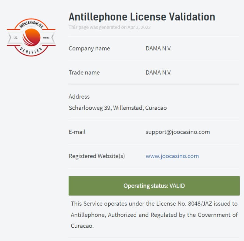ジョーカジノは、 Dama N.V.によって運営され、オランダ領キュラソーの法律に基づいてサービスを提供しています。また、キュラソーライセンス No. 8048/JAZ2020-13を保持しており、安全性に問題はありません。