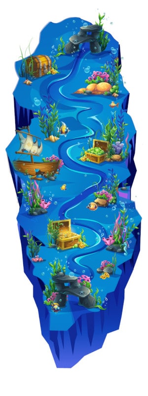 VIPページにいくと、可愛らしいお魚と宝のマップが出てきます。スロットで5ドルをベットするごとに、ポイント1CPが付与され、マップに進行状況(レベル)が表示されていきます。