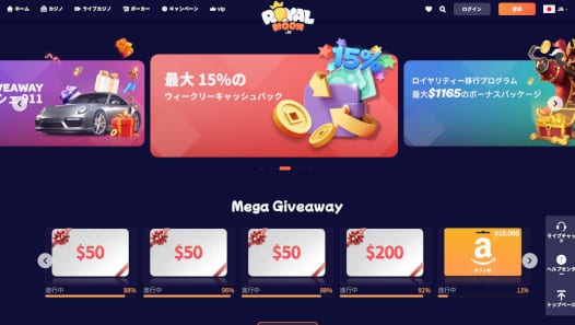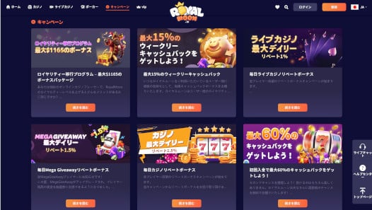 現在、ロイヤルムーンカジノでは、たくさんのプロモーションが開催され遊べば遊ぶほどお得になっています。常設のボーナスはありませんが、入金して負けてしまった場合、キャッシュバックが受け取れるという嬉しいサービスが実施中です!
