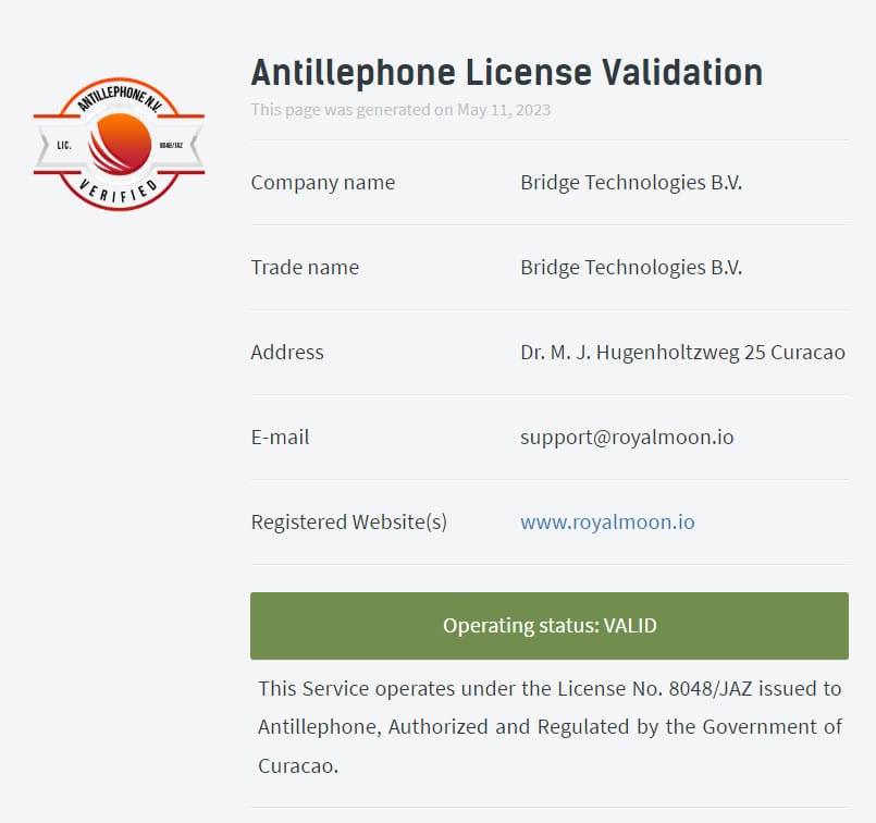 ロイヤルムーンカジノは、キュラソーの法律に基づいて設立された会社(会社登録番号 160264)Bridge Technologies B.V. によって運営、管理されてます。