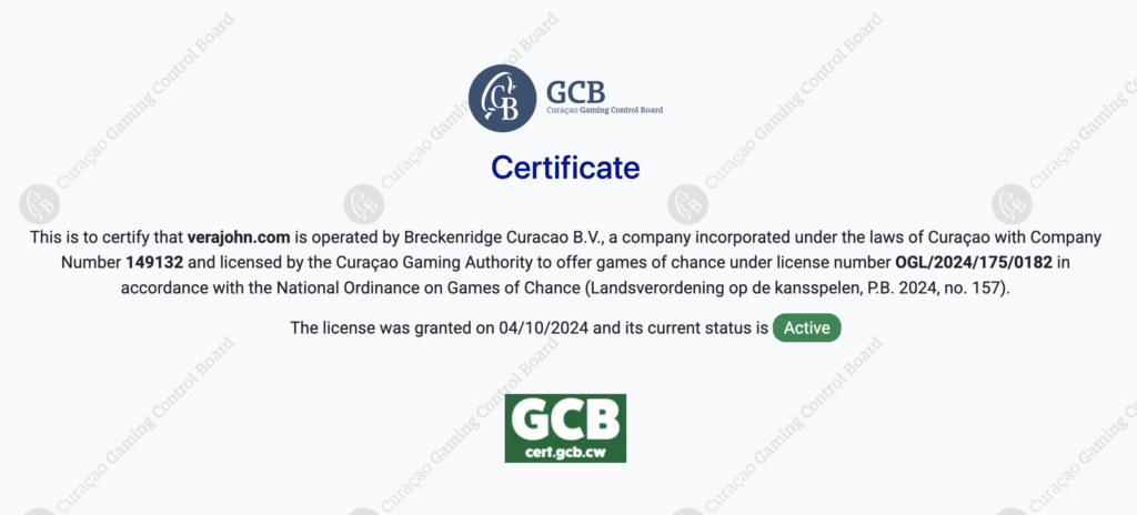 オンカジで遊ぶなら必ず確認しておきたいのはライセンスと安全性。ベラジョンはキュラソーeゲーミング ライセンスを取得しています。
